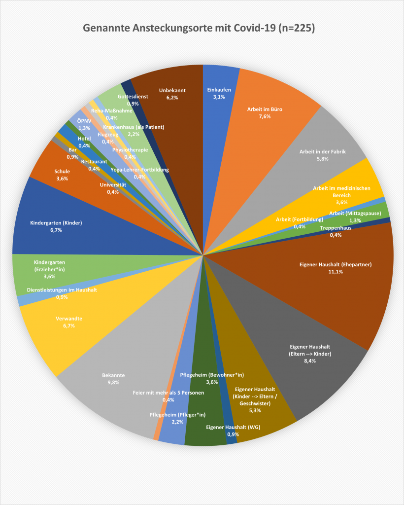 2.) Der von Gesundheitsämtern und Robert-Koch-Institut (RKI) postulierte Anteil von 75-80% an unbekannten Infektionen wird widerlegt. Nur 6% der Infizierten können nicht zuordnen, wie und wo sie sich angesteckt haben. Auch wenn man die Prozentzahlen der Bereiche „Einkaufen“ und „ÖPNV“ dazuzählen sollte, läge der Prozentsatz der nicht sicheren Zuordnungen deutlich unter 20%. Alleine die Ansteckungen im eigenen Haushalt bzw. Bekannten- und Verwandtenkreis, die von den Infizierten ja sicher nachverfolgt werden können, übersteigen bei weitem die von den Gesundheitsämtern aufgeklärten Infektionsketten. Der Wert von 75 bis 80% unbekannten Infektionen liegt entsprechend der Befragungsergebnisse daran, dass die Gesundheitsämter die Infektionswege in vielen Fällen nicht nacharbeiten und dokumentieren. 52% der Befragten gaben an, dass das Gesundheitsamt nicht gefragt habe, wie sie sich infiziert hätten, in 40% der Fälle fragte das Gesundheitsamt keine Kontaktpersonen ab. Nur sehr wenige der Befragten gaben an aus eigenen Interessen (z.B. Sorge vor rechtlichen Schwierigkeiten, Vermeidung der Quarantäne von Kontaktpersonen) keine oder falsche Angaben beim Gesundheitsamt zur Nachverfolgung gemacht zu haben, was neben mangelhafter Datenübertragung und unvollständiger Kategorisierung ein weiterer Grund für die hohe Dunkelziffer beim RKI sein dürfte.